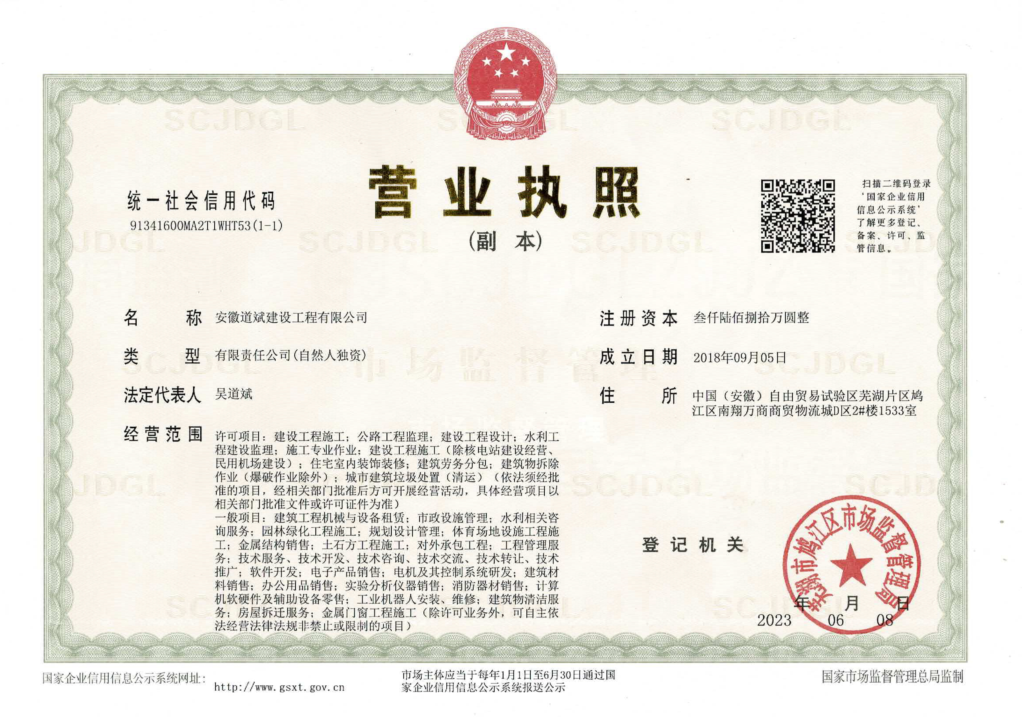 - 安徽道斌建設(shè)工程有限公司成立于2018年4月,主要從事工程施工、工程勞務(wù)、鋼結(jié)構(gòu)施工、市政公用施工,市政施工總承包貳級(jí)、地基基礎(chǔ)工程專(zhuān)業(yè)承包貳級(jí)、防水防腐保溫工程專(zhuān)業(yè)承包壹級(jí)、鋼結(jié)構(gòu)工程專(zhuān)業(yè)承包貳級(jí)、建筑裝修裝飾工程專(zhuān)業(yè)承包貳級(jí)、建筑工程施...